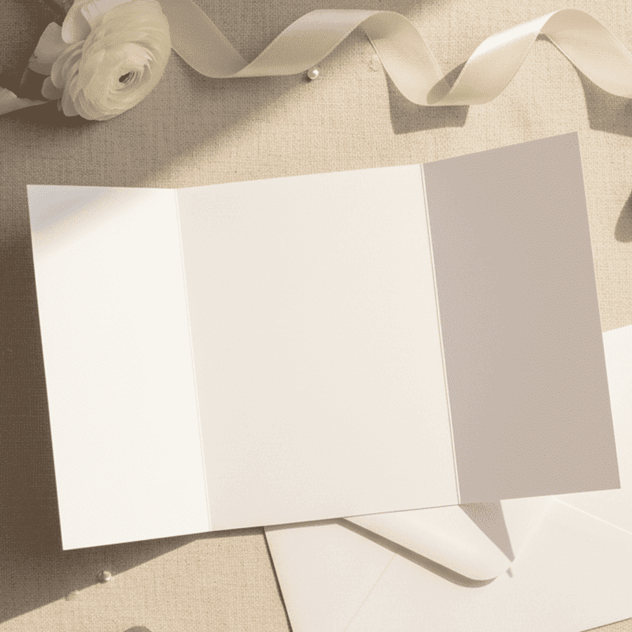 Votre design sera sublimé par notre impression professionnelle sur un papier de qualité (irisé blanc, vergé blanc ou mat légèrement ivoire). Format ouvert 26 x 18 cm.